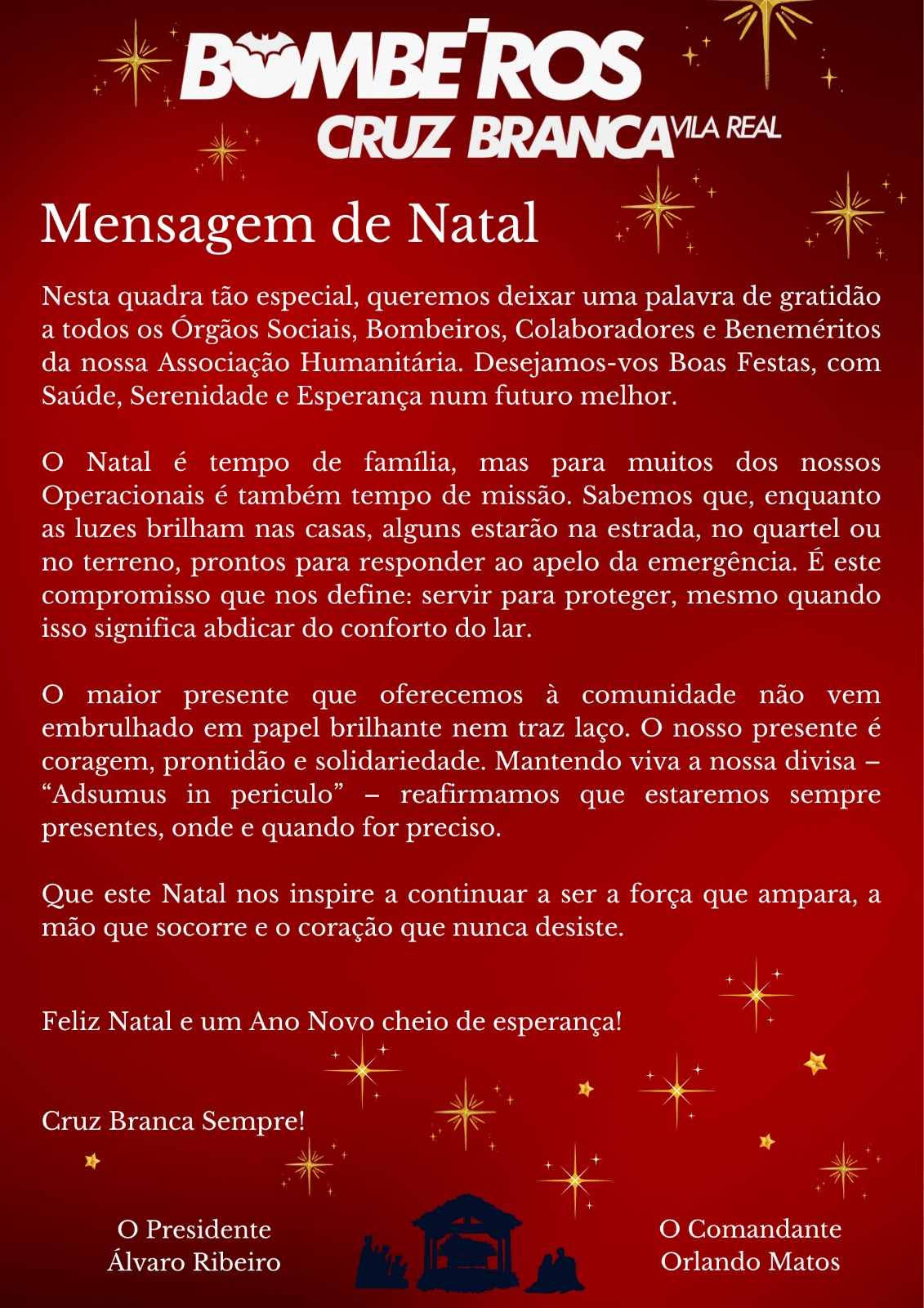 Nesta quadra tão especial, queremos deixar uma palavra de gratidão a todos os Órgãos Sociais, Bombeiros, Colaboradores e Beneméritos da nossa Associação Humanitária. Desejamos-vos Boas Festas, com Saúde, Serenidade e Esperança num futuro melhor. O Natal é tempo de família, mas para muitos dos nossos Operacionais é também tempo de missão. Sabemos...