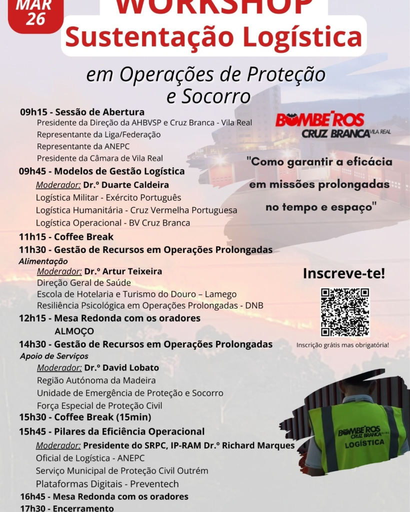 A Associação Humanitária dos Bombeiros Voluntários de Salvação Pública e Cruz Branca de Vila Real promove, no próximo dia 14 de março de 2026, um workshop dedicado a um dos pilares fundamentais da resposta operacional: a sustentação logística em cenários de emergência.