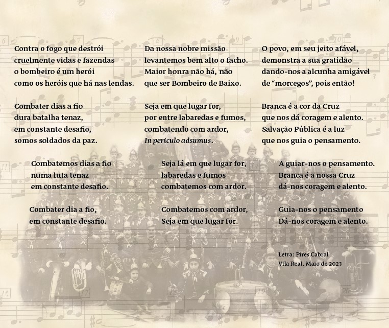 Este hino, composto numa fase em que o nosso Corpo de Bombeiros lutava pela própria sobrevivência, simboliza a dedicação, a coragem e o humanismo que definem, desde sempre, os nossos bombeiros.